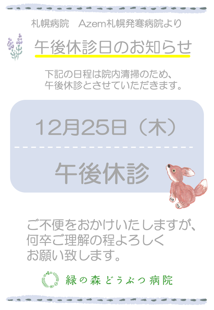 札幌病院・AZem札幌発寒病院より、12月25日午後休診のお知らせ